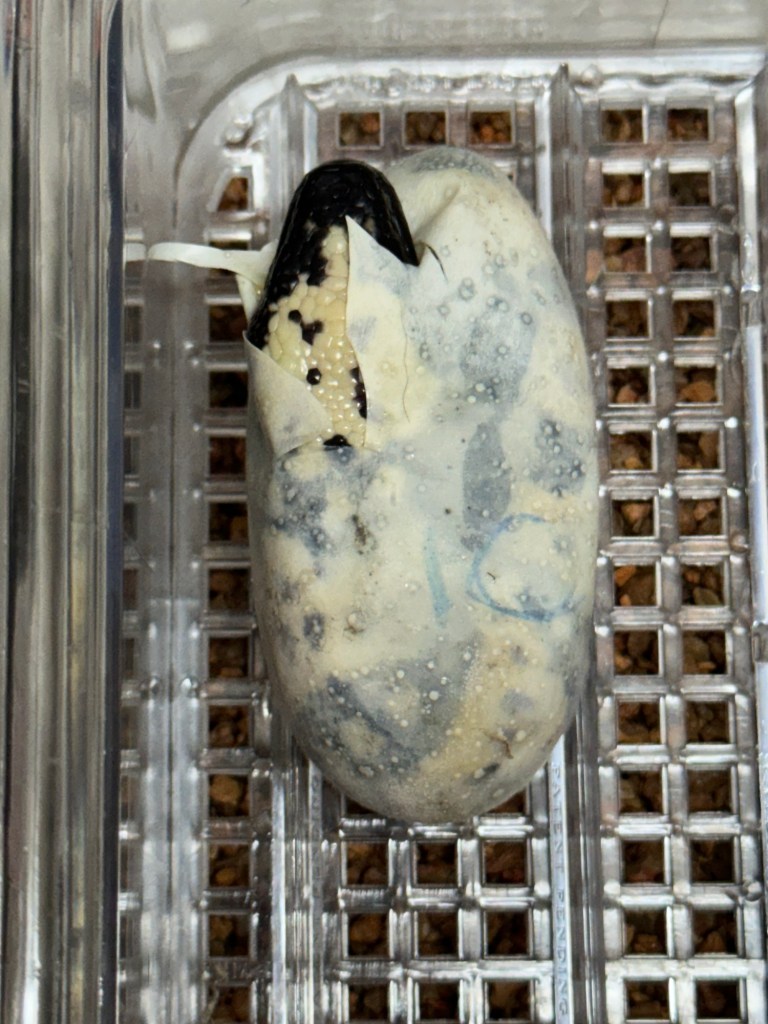 The last of our 2024 Gila monster egg is hatching as I write this. Looks to be another stunning banded Gila! The baby Gilas take a few days to come out of the egg, and it seems to take every ounce of newborn energy to do so. It’s also amazing to see as the size of the baby defies the space in the egg. All the trials and tribulations throughout the year just melt away when that little Gila pokes its nose through the egg.
