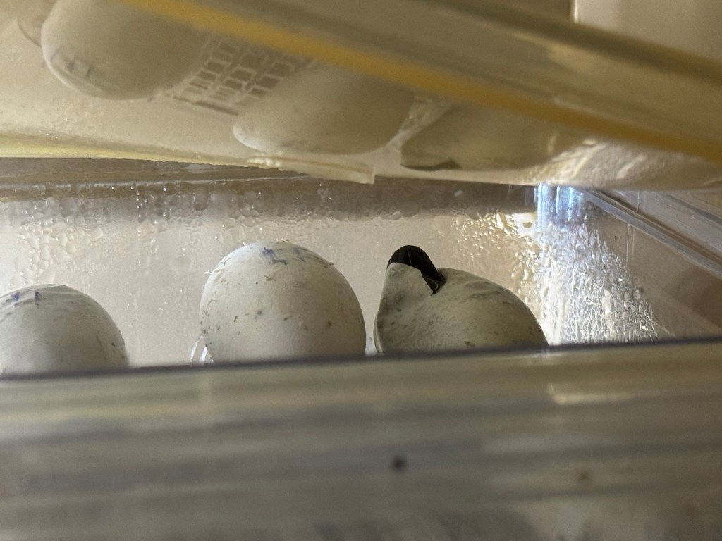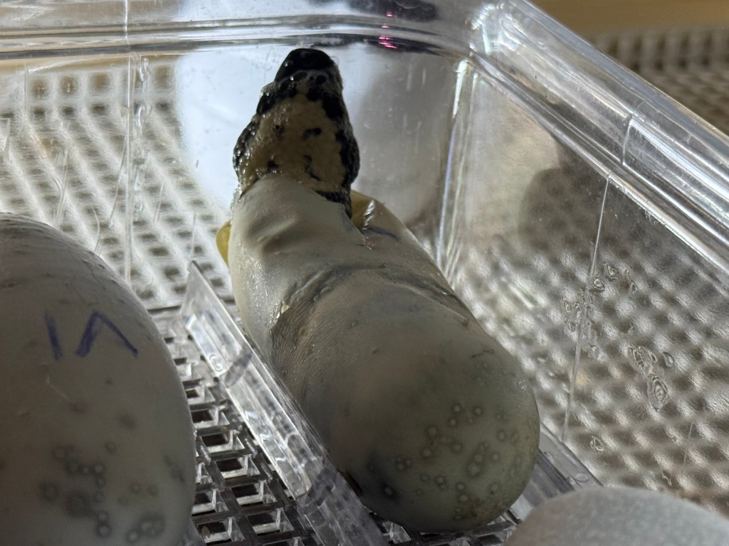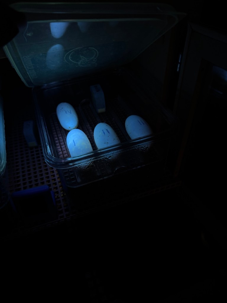 First the wins; I had an improved nesting experience (thanks to my mentor Dr. Mark Seward) with my stalwart females Belle and Heather who had their best year yet. The newbie females are still figuring it out and they laid partial clutches which are good, but held eggs that were ultimately unviable. Also, we had a disproportionate ratio of males to females so had to do some calculated male swapping so that likely factored into things. The females are also recovering nicely post breeding which bodes well for next year. I currently have ten good eggs in the trusty Grumbach S84 incubator which is great. There was a total of 22 eggs, 10 of which were infertile slugs or laid late, 2 fertile eggs went bad about a month after being laid, and 10 still a-cookin’. I always feel that if I have one egg hatch in a season it’s a win!