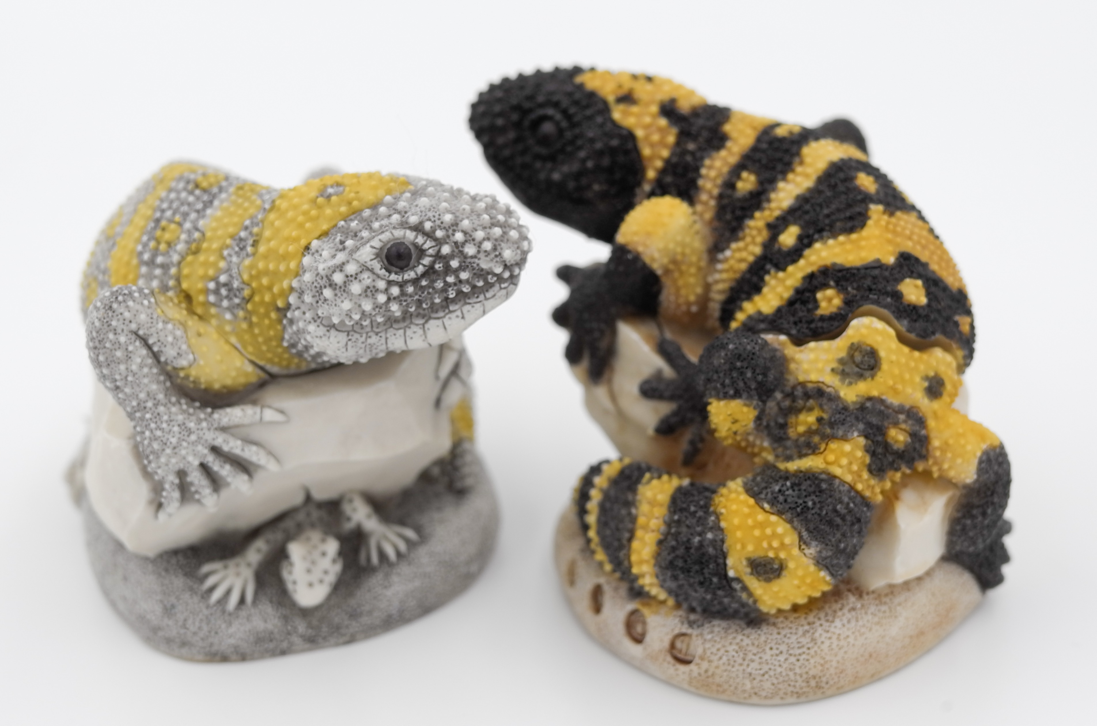 These boxes are a must-have for any Gila monster enthusiast. The detail on these boxes is amazing, especially considering their diminutive size. The osteoderms look real as do the proportions of the body and look of the lizard. Besides the great detail and the beauty of these boxes, there are a some cool Easter eggs for us enthusiasts. Here is what the card that comes with the boxes say: “The Gila monster is a venomous lizard native to the southwestern U.S. and northern Mexico. Not only did Peter painstakingly sculpt its reticulated pattern, but he included numerous secrets. Its Latin name, Heloderma suspectum, means studded skin. Suspectum derives from palaeontologist Edward Drinker Cope’s suspicion that the lizard may be poisonous due to its teeth grooves. Gila refers to the Gila River Basin in Arizona, where these lizards were once plentiful. Exenatide is a drug used in the treatment of diabetes and is a synthetic version of a hormone found in the saliva of the Gila monster. Open the lid of this fixed edition box figurine to find a baby hatching Gila and Peter’s initials under one of the rocks.” The tent cards (cards that come inside the boxes and to be set up for retail display) can be downloaded from the Harmony Kingdom website here: V1 V2