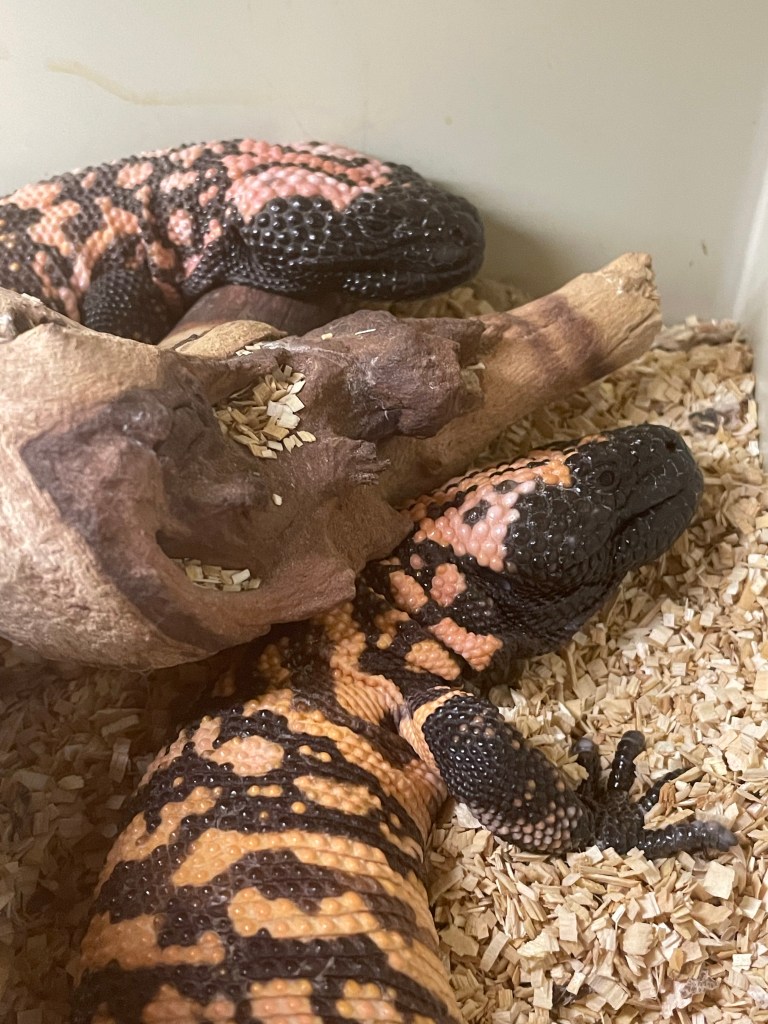 Belle & Pink Floyd (banded Gila monsters) resting sweetly in their hide cave