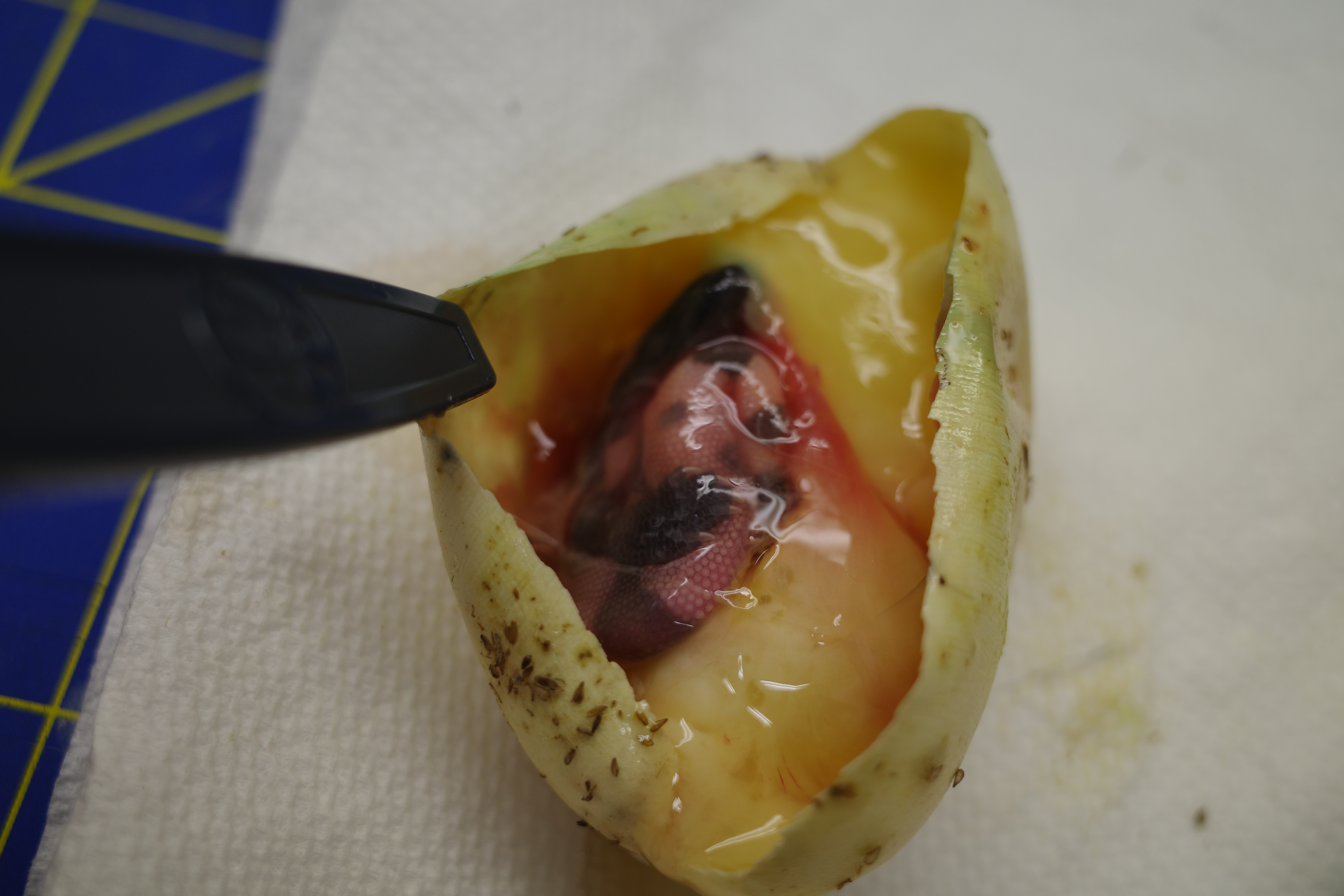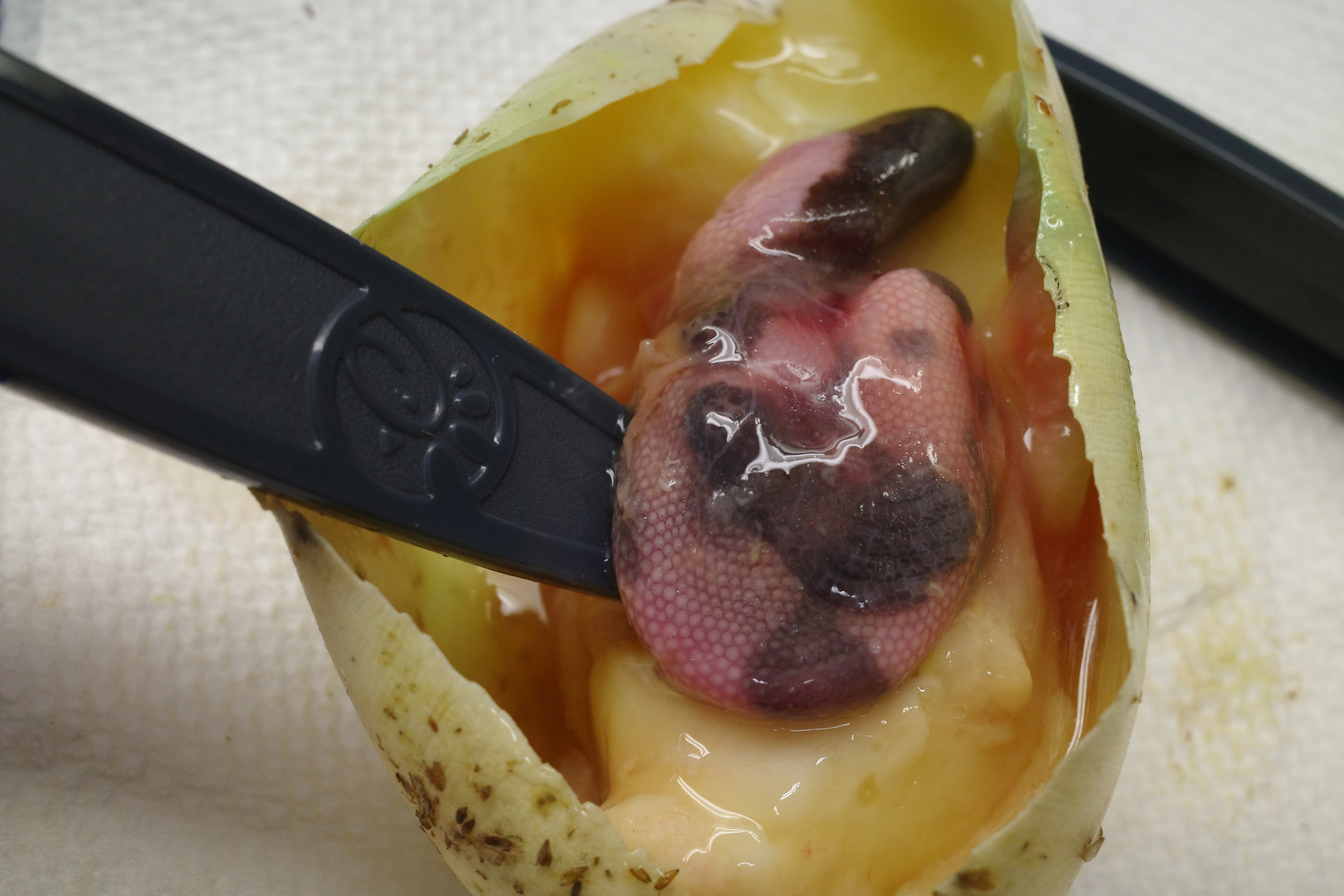 After removing the egg I was morbidly curious to see what was going on, and how far the embryo had developed. Sadly, a fully-formed Gila monster was inside. It was much smaller than the typical hatchling but appeared normal overall. Why did this embryo die after being alive for so long? Has it been dead for a long time? It’s hard for me to say at this point with my limited knowledge, but I really hope that the other five eggs are healthy and hatch. Regardless of how this season turns out I am going to thoroughly review my notes and protocols and see where improvements can be made and where things may have gone wrong. At this point, my feeling is that the females were not prepared last year for this season. Maybe it was improper temperatures or not enough food but this year I know all my adults are in proper order and ready for next year. I’m not giving up on this season yet and still have hope that the five remaining eggs will sprout baby monsters in the next few weeks!