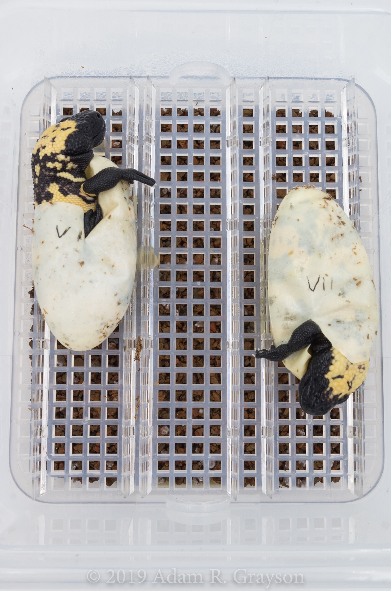 So, almost after all hope was lost on Day 153 the first Gila monster egg pipped from its leathery shell! Egg 02 at first cut a small slit and then a few more and over the next two days began to emerge from the egg. At first the baby Gila stuck its nose out, then it’s head, then half its body, and finally the entire body. It appears that hatching is a labor-intensive process as there are long pauses between progressive stages and also seems to be a good way of ensuring all the contents of the egg are consumed before leaving the egg. Over the ensuing days this process was (and currently is for two more lizards) repeated over and over, with Gilas emerging from their shell about two or so full days from pip to full emergence. Once the contents are completely devoured the neonate Gila monster leaves its shell and begins to wander the egg box. I witnessed one Gila that was out actually eating the egg yolk of another just coming out of its shell! Greedy bastard.